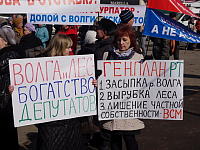Лишение нас возможности отдыхать на чистой реке, ловить рыбу, чтобы наши дети и ветераны войны могли спокойно отдохнуть на берегу Волги, дышать свежим воздухом в лесу и жить спокойно в собственном доме, защищенном правом собственност - это и есть прогресс? Где глава Зеленодольского района, который первым должен был навести порядок в собственном районе, защищать интересы граждан? Люди сами встали на защиту Волги, своих домов и лесов. Требуем от правительства вернуть нам народное достояние - Волгу, леса, а частную собственность не подвергать сомнению законом об изъятии"