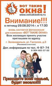 Внимание!!! Компания "Вот такие окна!" рада сообщить, что 29 августа (в эту пятницу) в 17:00 вновь состоится фотосессия в Зеленодольске по адресу ул. Гастелло, д.3 (Рекламное агентство "777").