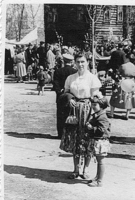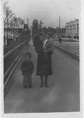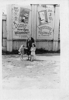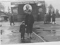 На фоне деревянной трибуны, возле которой проходили все демонстрации. Правее трибуны - площадь ДК "Родина", левее - старые деревянные постройки. Сейчас на этом месте - пятиэтажный дом.