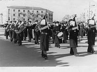 По улице Ленина на демонстрации идёт военный оркестр из зеленодольской морской части. 1960 год.