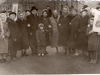 Работники ИТР СМУ-18 перед демонстрацией. Слева - портрет Хрущёва, справа Суслов на портрете.
