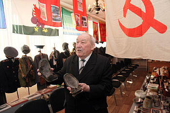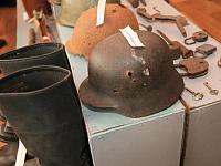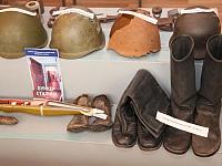 На солдатских касках - следы сражений, пулевые отверстия. Многие экспонаты время не пощадило - от солдатских ботинок остались только резиновые подошвы, кожаная часть сгнила.