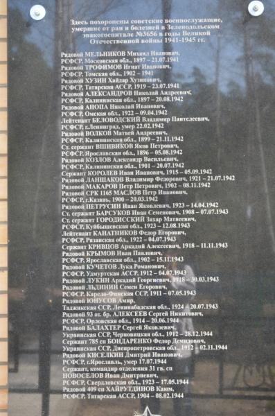 Найти братскую могилу красноармейцев и офицеров, умерших в Зеленодольском госпитале № 3656 в 1941-45 гг. легко. Находится она на «Старом» кладбище, в его южной части, на склоне к Волге. Можно зайти или заехать в главные ворота городского кладбища и двигаться от ворот прямо, на юг, никуда не сворачивая. Асфальт закончится и начнется грунтовка под уклон, слева будут ступеньки и дорожка, вымощенная плиткой. В конце дорожки новый памятник, прямоугольная стела, выложенная из облицовочного кирпича. На стеле имеется мраморная табличка с 30 фамилиями. Думаю, что это не все, кто покоится в братской могиле. В Тарловке, в Елабужском районе, где недавно побывал Иосиф Кобзон, захоронено 166 человек.