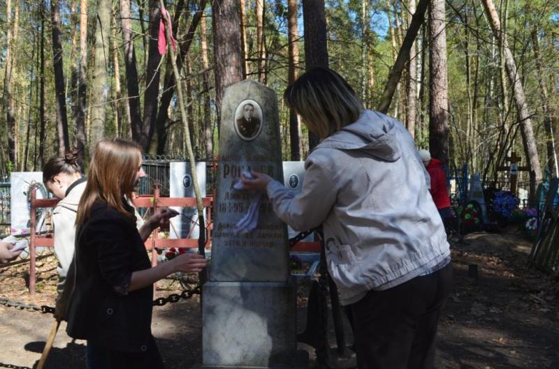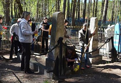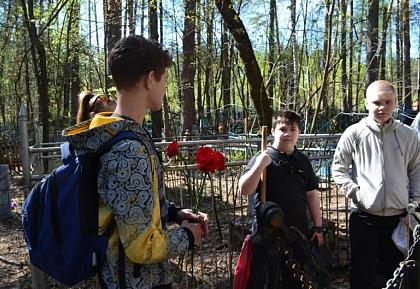 Нас выручили ребята из школы № 4 им. Д.Д. Рогачева, которые по заведенной в этой школе традиции пришли прибраться на его могиле и могиле его жены и возложить цветы. Ребят-семиклассников привели руководитель школьного музея Марианна Анатольевна Марьина и учитель истории Татьяна Михайловна Зайкова. Часть ребят отправилась к братской могиле, воинов, умерших в Зеленодольском госпитале, часть осталась прибираться на захоронении адмирала Рогачева.