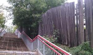 Как видно на фото забор держится на честном слове. Уже навис над лестничным проходом. Прохожих много, доски от забора отваливаются и создают опасность.