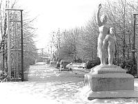 Вход в городской парк. В парке стояли скульптуры.