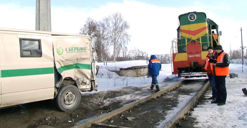 Машина инкассаторов столкнулась с локомотивом на железнодорожном переезде