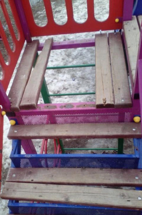 31 марта "На горке (детская площадка между Норкина,6 и Норкина,3) зияют дыры - отсутствует несколько досок! А некоторые из тех дощечек, что остались на месте, закреплены лишь болтами без гаек... Просим принять меры, пока никто из детей не покалечился!