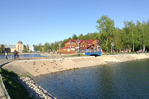 Местным жителям, правда, было как-то непонятно, как лесочек между улицами Ленина и Карла Маркса, Космонавтов и Юности — фактически в географическом центре города — будет «привлекать инвестиции». Издавна пронизанный тропками, что муравейник — ходами, этот лесопарк связывал улицы приятным зеленым променадом по маршруту «дом — работа» или «дом — рынок». Хотя у самого озера все тот же Емельянов привлек инвестиции, инициировав строительство развлекательной «Джумбы», обшитой блок-хаусом, и кафе «Мельница» со стилизованными крыльями. А со стороны улицы Ленина лесок обнесли дощатым забором — уложенными в горизонтальную линию нестрогаными досками, за что интеллигентные горожане (а город с его конструкторским бюро и оборонкой все-таки был магнитом интеллектуалов в советские времена) неласково назвали этот дизайн «деревней». Сама чаша озера с двух сторон обрамлена высоченной многоэтажкой и бизнес-центром с гостиницей, на стене которой кирпичами даже выложена фамилия «отца-основателя» — Грабец...