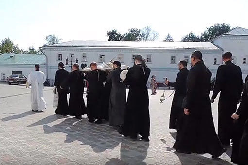 Ближе к 14 часам суета у здания наместника монастыря усилилась. «Где братья наши?» — выходя из помещения, воскликнул один из священнослужителей. Это был своего рода призыв собраться, чтобы перенести тело.