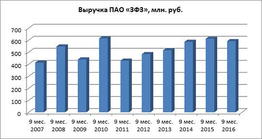 Разбор финансовых полетов ЗФЗ начнем по порядку — с выручки, которая по итогам января-сентября 2016 года сократилась лишь на символические 3,3% до 590,8 млн. рублей. И здесь ничего не указывает на то, что на предприятии запущены кризисные процессы: объем выручки находится выше уровня 2014 года и не претерпел таких потрясений, как, скажем, в 2009-м или в 2011-м.