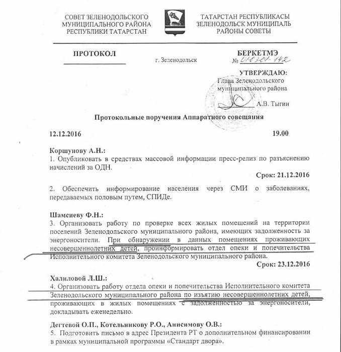 Изымать детей из семей, которые задолжали за газ и электричество, поручил своим подчиненным глава Зеленодольского района Александр Тыгин. Жесткость формулировки официального документа может заставить содрогнуться даже искушенного читателя. Столь радикально к решению проблемы малоимущих семей, чьи дома и квартиры из-за коммунальных долгов находятся зимой под угрозой отключения от энергоснабжения, в Татарстане, пожалуй, еще никто не подходил.
