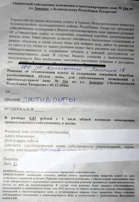 Итак что предлагает бумажка: Управление по делам молодежи, спорту и туризму Исполнительного комитета ЗМР РТ предлагает собственникам помещения в Вашем многоквартирном доме принять решение об установлении платы за содержание хоккейной коробки, расположенной вблизи дома. Такое решение позволит обеспечить надлежащее содержание и ремонт объектов, а также оплаты воды для заливки льда, работ по расчистке от снега и т.п. Отказ от такого решения может быть расценен как отсутствие заинтересованности в сохранении объекта в шаговой доступности от многоквартирного дома. В случае Вашего согласия с вышеуказанным предложением Вам необходимо заполнить настоящее решение и доставить его... далее адрес жилконторы УК.