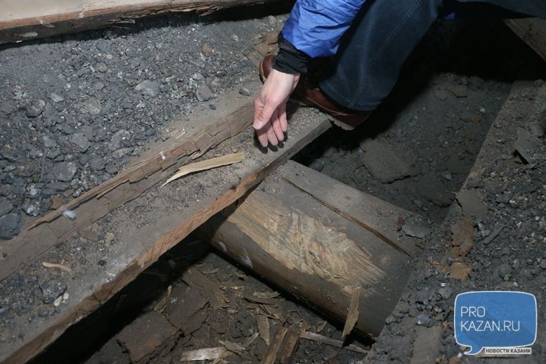 Владимир показывает, как вскрывали пол на чердаке и проверяли состояние досок