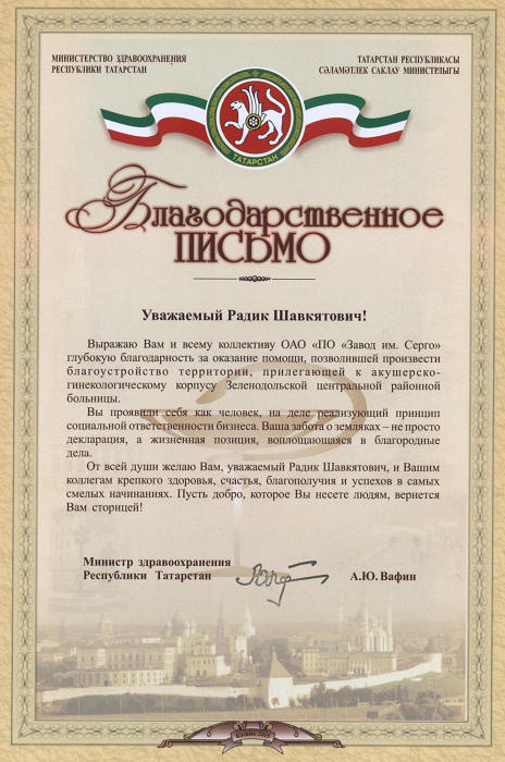 Министр здравоохранения РТ Адель Вафин наградил предприятие POZIS благодарственным письмом министерства за оказание помощи в благоустройстве лечебно-профилактических учреждений региона.