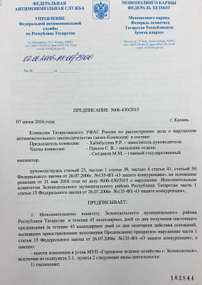 Предпринимателю это порядком надоело, и он обратился в Антимонопольную службу, предоставив все имеющиеся документы. Антимонопольщики, изучив документы, выявили ряд нарушений со стороны Исполкома и возбудили дело № 06-430/2015 от 07.06.2016г. Комиссия УФАС Татарстана выдало предписание исполкому исключить из устава МУПа следующие виды деятельности: - озеленение, - благоустройство, - cодержание и ремонт дорог и сооружений на них, - оказание ритуальных услуг населению в полном объеме, а также принять меры по прекращению права хозяйственного ведения МУП "Городское коммунальное хозяйство" на общественные бани. Что касается ИП Глазкова Д.А., то по его помещениям было предписано провести торги согласно ФЗ №135 "О защите конкуренции".