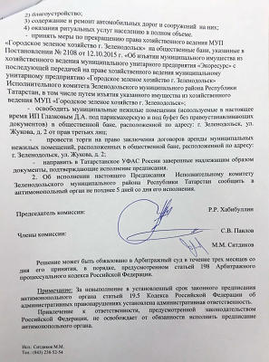 Исполком не исполнил предписания УФАС РФ по РТ и, в нарушение законных требований УФАС, позволил МУПу провести аукцион, хотя МУП не имел на это никаких прав и полномочий (по решению ФАС бани должны быть изъяты из хозведения данного МУПа).
