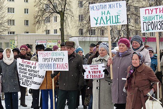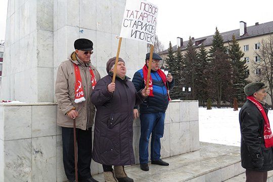 В митинг против сноса аварийного жилья превратилась задумка зеленодольских коммунистов поднять извечную проблему ЖКХ в минувшую субботу, 25 марта. Местные члены КПРФ, обвязанные красными шарфиками и держащие в руках транспаранты с призывом "За услуги ЖКХ — не более 10% от дохода семьи" и с требованием "Принять закон "О детях войны!", оказались магнитом для зеленодольцев, протестующих против признания их жилья аварийным и перспектив переселения в соципотеку. Большинству из примерно 80 человек, пришедших к памятнику Владимира Ленина в довольно неприятную погоду, когда можно поскользнуться на льду, а через шаг наступить в лужу, было не до счетов-фактур за коммунальные услуги. Люди, в подавляющем большинстве пенсионного возраста, держали самодельные плакаты, гласящие: "Выселяют на улицу из хороших домов", "Защитим жилье от жулья", "По решению судов мы бомжи. За что?", "Суды против народа", "Позор Татарстану. Стариков на ипотеку". Выделялся среди митингующих маленький мальчик со смущенной улыбкой, державший в руках плакатик "Я не хочу жить на улице".