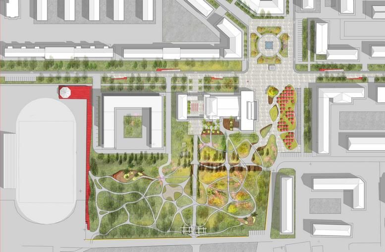 В самом парке приведут в порядок деревья и высадят новые. По периметру построят дорожку для катания на роликах и скейтах, в центре появится детская площадка. В дальней части парка, примыкающего к стадиону, построят так называемую верхнюю дорожку, с которой можно будет понаблюдать за игрой в футбол.