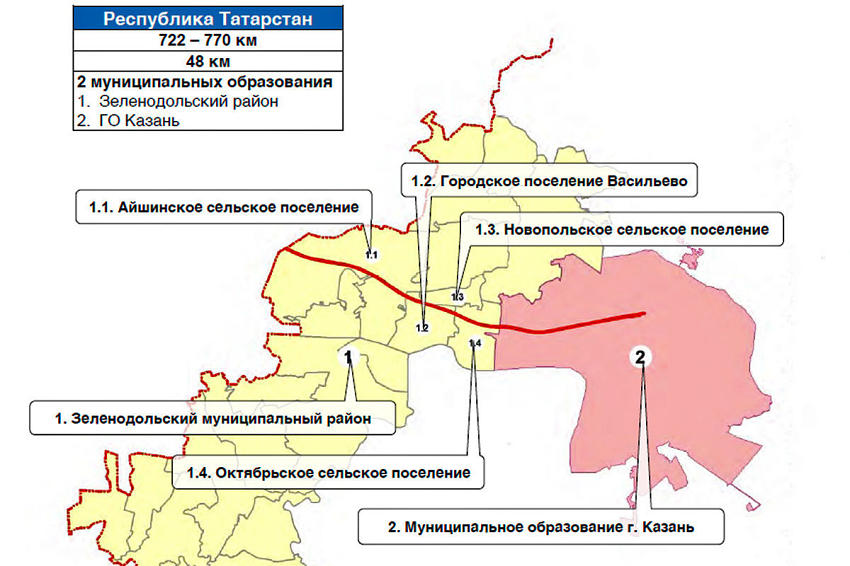 Земляные работы в пределах Зеленодольского района составят 2 млн. куб. метров. Будет 10 эстакад общей протяженностью 7 км (в Казани пять, но такой же протяженности), два моста (один через реку Сумку). Трасса проходит по территории Айши, поселка Новопольского, Октябрьского, пгт Васильево и города Зеленодольска, а также затрагивает садоводческие товарищества — "Полянка" и "Колос-2".
