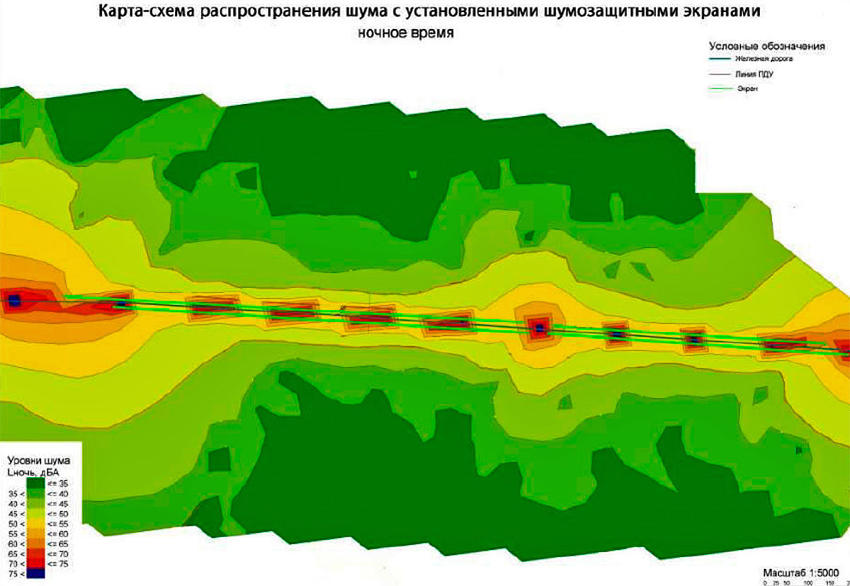 Карта-схема распространения шума с установленными шумозащитными экранами (ночное время)