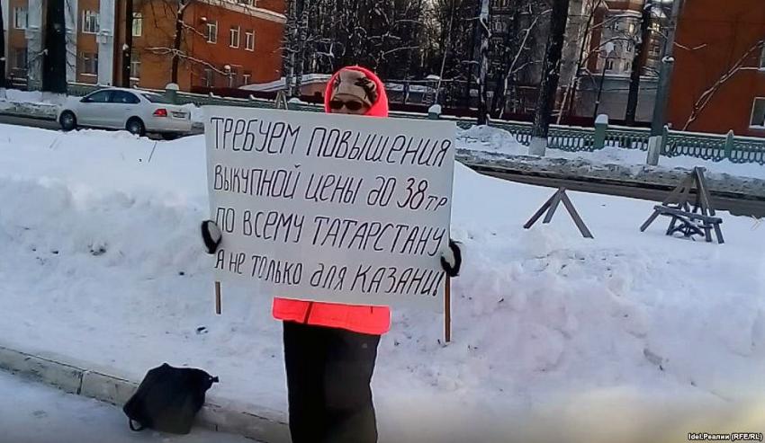 Несколько аварийщиков пытались привлечь внимание главы республики, посетившего Зеленодольск. Они вышли с плакатами: "Мы не хотим быть бомжами" и "Требуем повышения выкупной цены до 38 тысяч рублей по всему Татарстану, а не только для Казани".