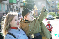 В строгих каре застыли участники парада, трибуны стадиона «Комсомолец» заполняются людьми. «Во имя мира, а не горестей войны» выходят на зеленое поле стадиона дети в ярких костюмах. Песня в исполнении ансамбля «Воскресение», имитация наступления темных сил под немецкий марш, «Священная война» и танец радости – такой эмоциональной композицией хореографических коллективов «Антре», ВЭД, «Орфей», «Веснушки», «Вдохновение», «Platinum», «Золотой микрофон» начался праздник.