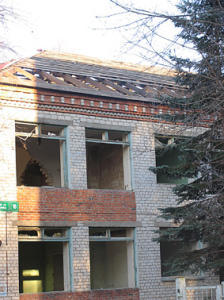 Изменения есть. Только в худшую сторону. Если в прошлом году здание было покрыто новым профнастилом (значит, на объект кто-то имел виды), то нынче на его кровлю страшно смотреть — предприимчивые сограждане разобрали ее больше чем наполовину и уже принялись за обрешетку. Творящееся внутри вообще с трудом поддается описанию. Складывается ощущение, что сюда ходят не только пить, колоться и справлять нужду, но еще проверять надежность только что купленной кувалды. Здание методично разрушается всеми доступными способами. Разбиты перегородки, лестничные марши, про окна и говорить не приходится. Но главное — несущие стены и перекрытия — вроде еще ничего.