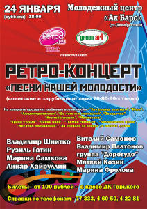 - Первый концерт студии в 2009 году состоится 24 января. Это будет большой ретро-фестиваль «Песни нашей молодости» в Казани. Первый ноябрьский концерт проекта в столице прошел «на ура» и произвел серьезное впечатление на казанскую публику. Вдохновленные успехом, мы подготовили совершенно новую программу – в форме не просто концерта, а яркого шоу. Второй ретро-концерт пройдет там же - в Молодежном центре «Ак Барс». Участие в нем примут известные казанские артисты и коллективы, и, конечно же, звезды зеленодольской сцены - Владимир Шнитко, Рузиль Гатин, группа «Dorogudo», Марина Фролова, Линар Хайруллин, Виталий Самонов, Владимир Платонов, Марина Самкова и другие исполнители.
