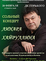- Спешу успокоить - зеленодольского зрителя тоже ждет немало интересного. Так, 28 февраля следующего года в ДК Горького пройдет сольный концерт одного из самых популярных исполнителей Линара Хайруллина. Хочется отметить, что этот артист всегда был достоин отдельного концерта, и сейчас – в год 30-летия сценической карьеры - пришло время его провести. Основой программы сольника станет ретро-музыка – от 50 до 90-х годов (в том числе супер-шлягеры, которыми он запомнился зрителю на прошедших концертах «Песни нашей молодости»), современные хиты и авторские композиции зеленодольских авторов. На концерте пройдет презентация второго альбома Линара, артиста поддержат его друзья-исполнители - Виталий Самонов, Владимир Платонов, Ольга Матяшина, Кристина Попова, Марина Фролова и казанские артисты. Этот концерт однозначно понравится всем зеленодольцам, особенно «зрелому» поколению слушателей.