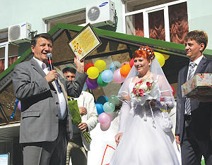 Глава ЗМР напомнил о том, что по итогам республиканского конкурса «Самый благоустроенный населенный пункт Республики Татарстан-2008», проводимого Министерством строительства, архитектуры и жилищно-коммунального хозяйства Республики Татарстан III место присуждено городу Зеленодольску. Он отметил, что это не последняя вершина: нужно стремиться к победе не только на республиканском, но и на российском уровне. Аплодисменты вызвало появление на сцене жениха и невесты: Радик Шавкятович поздравил вступающих в брак в этот день Константина Меньшагина и Ирину Костюк и подарил нужный для молодой семьи подарок – холодильник «POZIS».