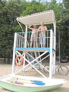 В последние годы стало привычным отсутствие здесь охранников, спасателей и медиков. Даже начальство избегало термина «городской пляж», поскольку на самом деле данная территория принадлежит Гослесфонду, и настоящие хозяева здесь – лесники. И вот недавно здесь появилась спасательная вышка. Ее мы никак не могли обойти стороной.