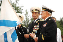 Звучит горн и объявляется торжественный подъем флага ВМФ России. Честь поднять флаг доверена ветеранам флота: бывшему командиру Зеленодольской военной бригады, капитану 1 ранга Владимиру Полоротову и капитану 1 ранга Борису Поплавскому (на снимке справа). Ввысь вздымается флаг ВМФ и флаги расцвечивания, звучит гимн Российской Федерации.