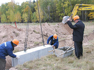 ...На стройплощадке, выделенной за досафовским автодромом, собралось много народу: строители, руководители различных служб, журналисты... Строители деловито устанавливают первые секции ограждения, экскаваторщик копает траншею, а на лежащих рядом железобетонных блоках кто-то через трафарет наносит краской: «Станция обезжелезивания, 05.10.2009».