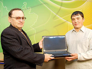 «Зеленый Дол» дарит подарки: директор телекомпании Олег Муртазин вручил ноутбук работнику «ПОЗИСа» Роберту Бахтиярову.