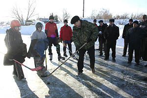 В деревне Татарское Танаево юные хоккеисты увлеченно гоняли шайбу. Хоккейную коробку они расчис-тили сами: вокруг — огромные сугробы. У них нет настоящей формы, даже шайба самодельная (мягкая, чтобы не травмировать игроков), зато энтузиазма более чем достаточно. Вратарь, как дополнительную защиту, надел на руки тело-грейку. Все лето ребята с увлечением играют в футбол, зимой расчищают каток, не ленятся.