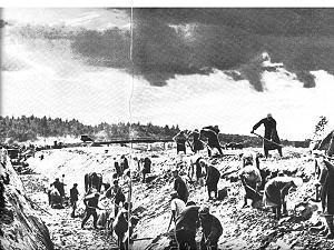 Сразу же возникла проблема: что делать с избытком не готовой рабочей силы? Отказ от работ расценивался как государственное преступление. Мобилизованная на ту стройку из Зеленодольска А.Пыркова вспоминала: «Нас высадили в поле и разместили по избам окрестных деревень. Начались изнурительные каторжные работы от рассвета до заката. Сразу же набили мозоли, на руках кровавые волдыри, а вокруг голод, холод. Рвы копают одни женщины. Грунт — а это в основном глина — вынимаем на носилках и насыпаем высокую стенку. Тут пошли дожди, обувка наша нехитрая сразу расползлась, а домой отлучиться никак нельзя. Копаем под дождем, по колено в грязи. Потом ударили морозы. Землю долбили ломами и кирками, кувалдами забивали в нее клинья. Машин и лошадей почти не было, все делали руками».