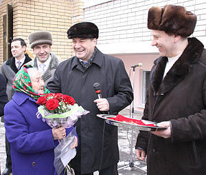 На митинге новоселов поздравили глава ЗМР Радик Хасанов, глава поселка Алексей Шмуклерман и директор фирмы-застройщицы (ООО «Восход») Евгений Романов.