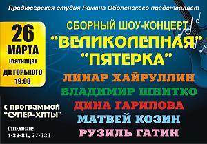 Отечественные и зарубежные хиты «всех времен и народов» вокалисты исполнят на сборном шоу-концерте с говорящим названием «Великолепная пятерка», который пройдет в ДК им. Горького 26 марта (это будет пятница). Начало концерта – в 19 часов.
