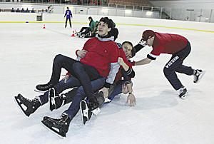 На ледовую арену в тот день вышла пятерка отважных из шести различных объединений – «Молодая гвардия» (представители молодежного крыла партии «Единая Россия»), «Альтаир» (штаб студенческих трудовых отрядов), «Форпост» (активисты молодежного правозащитного формирования), «Golden stars» (объединение творческих сил города), члены ассоциации работающей молодежи. Им предстояло продемонстрировать физическую форму и командный дух, знание отечественной истории и истории праздника и главное — умение хорошо держаться на коньках.