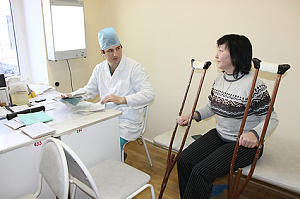 Через час приема пациентов становится только больше. По очереди заходят женщина, затем – мужчина, обоим в этот день сняли гипс. «Почему я ногу не чувствую, как деревянная?», – волнуется пациент. «Ее надо разрабатывать», – советует травматолог. Лечебная физкультура, массаж, специальные мази – необходимые процедуры в период восстановления.