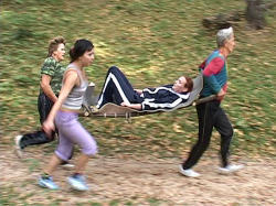 Первый этап — полоса препятствий. Учителям, среди которых традиционно не только физруки, но и предметники, предстояло поставить палатку, пройти по болоту, по параллельно натянутым веревкам, по бревну, преодолеть подъем по веревке, перенести на носилках пострадавшего.