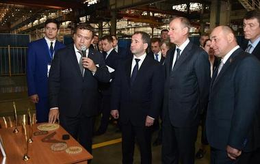 Осмотр производственных площадок Николай Патрушев и Михаил Бабич начали с посещения корпусозаготовительного цеха, где они ознакомились с ходом модернизации мощностей, реализуемой в рамках Федеральной целевой программы.